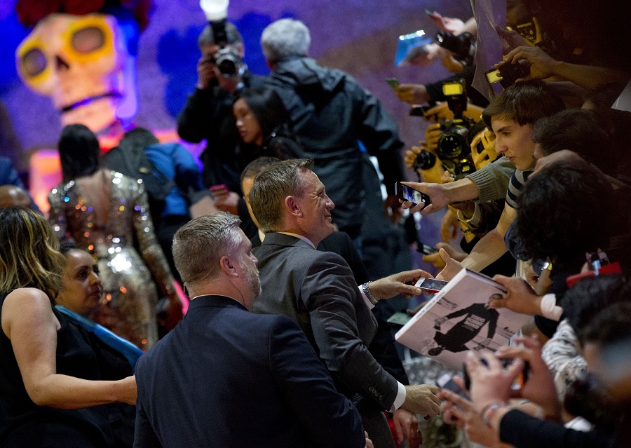 Actor Daniel Craig takes a selfie for a fan as he walks the red carpet at the regional premiere of the latest James Bond film, "Spectre," at the National Auditorium in Mexico City, Monday, Nov. 2, 2015. (AP Photo/Rebecca Blackwell)