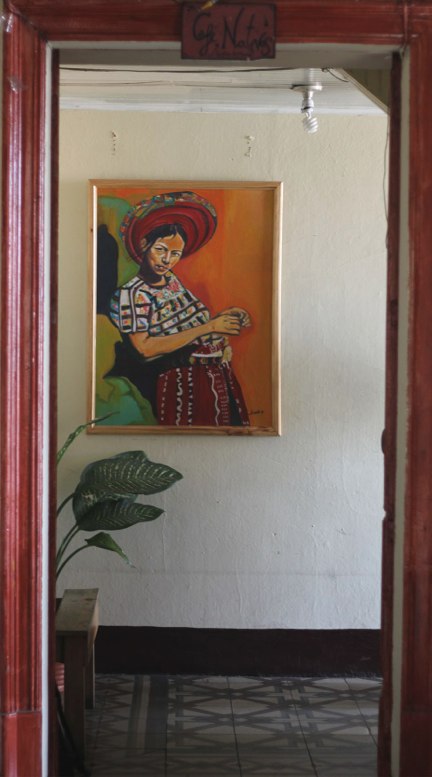 Con estas palabras llegamos a Casa Nativos. Al subir las impactantes escaleras redondeadas que llevan al establecimiento en el segundo piso, nos recibió su primera pintura expuesta: una joven indígena de Santiago Atitlán, que observa al visitante con una mirada determinada y fuerte. Esta obra nació de observar a una chica en el lago, comentó al pasar. Adentro del restaurante nos encontramos con su colorida versión de la Mona Lisa. En este momento empecé a dejar fluir mi curiosidad.
