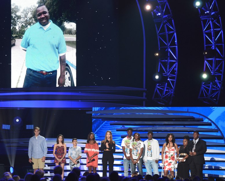 Durante la gala de los premios que reconocen a los preferidos del público adolescente, la actriz compartió escenario con un grupo de jóvenes relacionados con víctimas de las balaceras de San Bernardino, en California; Newtown, en Connecticut; y Orlando, en Florida.