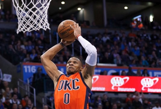 Russell Westbrook totalizó 30 puntos, 12 asistencias y nueve rebotes en un partido en que el Thunder de Oklahoma City remontó una desventaja de 11 unidades en la segunda mitad para vencer ayer 122-112 a los Nuggets de Denver.