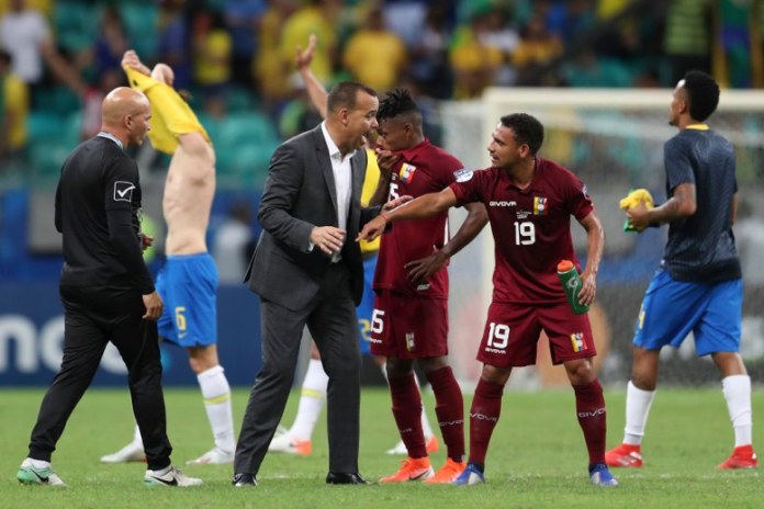 El técnico de Venezuela Rafael Dudamenl (segundo a la izquierda) reacciona junto a Arquímides Figuera (19) tras el empate 0-0 contra Brasil. Foto la hora: Natacha Pisarenko/Ap.