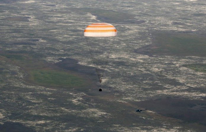 La cápsula que transportaba al ruso Oleg Novitsky y el francés Thomas Pesquet descendió mediante un paracaídas blanco y rojo a las 20:10 horas (1810 GMT) en las estepas de Kazajistán cerca de Dzhezkazgan, 2 mil 200 kilómetros al sureste de Moscú.