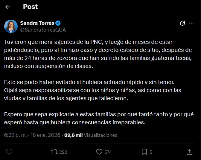 La excandidata presidencial, Sandra Torres, en sus redes sociales expresó molestia con el presidente Bernardo Arévalo. “Ojalá se responsabilicen con los niños y niñas, así como con las viudas y familias de los agentes que fallecieron”. Señaló al presidente de ser responsable de los motines y ataques contra la PNC.